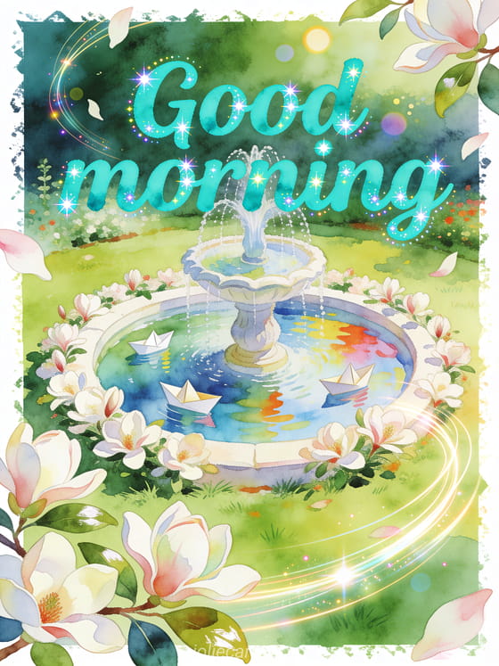 Send animated good morning cards with lively turquoise watercolor lettering, a playful garden fountain, magnolia blossoms and floating paper boats. Discover also a good morning you virtual card, special person morning good morning message or good morning message for your crush.