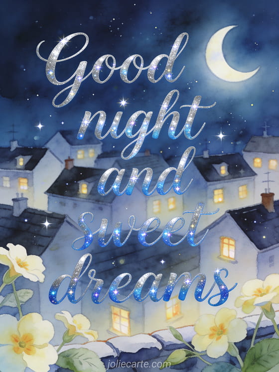 Wish good night and sweet dreams with small rooftops, glowing windows, a crescent moon and primrose flowers in clear night colors. Discover also a message to wish goodnight, a good evening and good night message or a good night message for your lover.