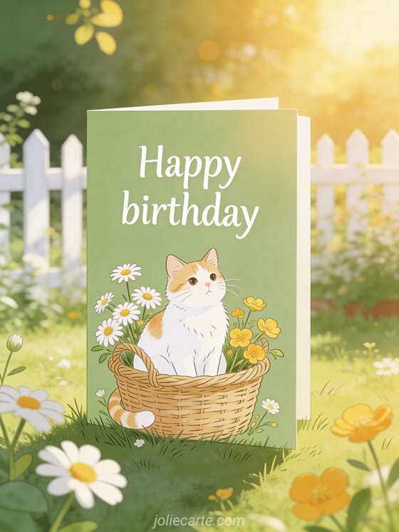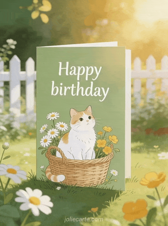 Celebrate with an animated happy birthday cat card featuring a ginger cat, daisies, buttercups, and a sunny garden setting. Discover also happy birthday cat animated gif gif, pretty free animated birthday card, and anime birthday card.
