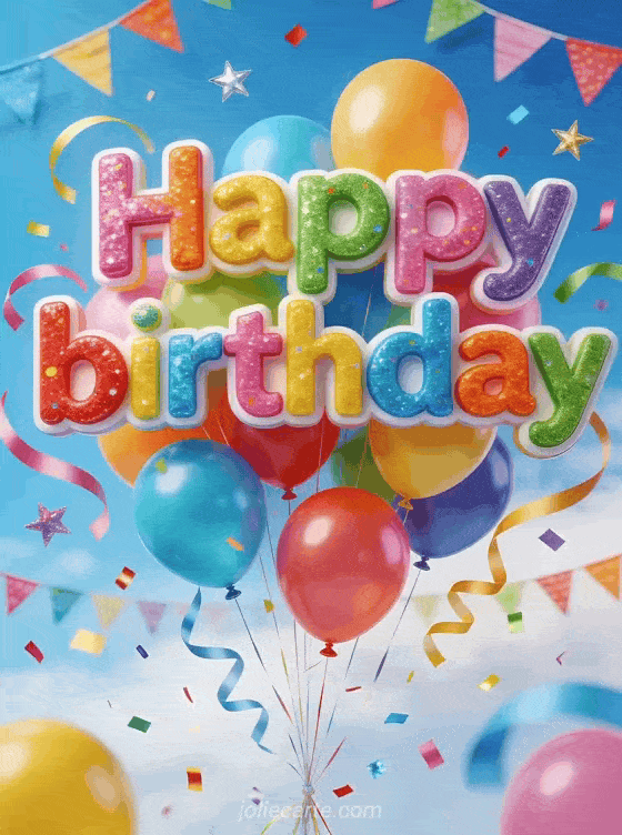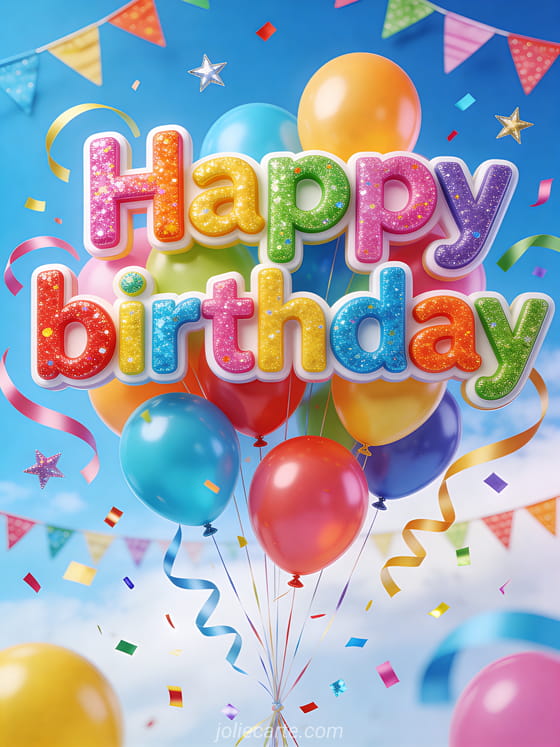 Share a bright birthday greeting with multicolored glitter letters, colorful balloons rising into a blue sky, waving ribbons, falling confetti, festive pennant garlands, and stars. You can also send a happy birthday mom card, a happy birthday card for a young mom, or happy birthday mom images.