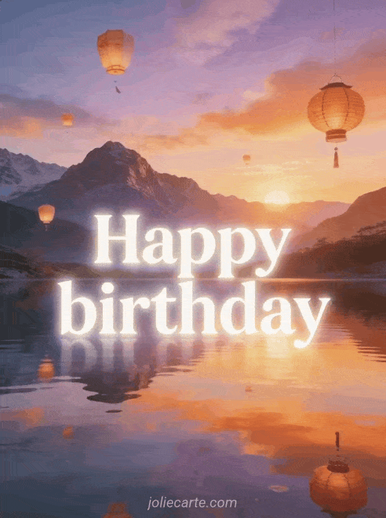 animated happy birthday A magical and serene birthday greeting with mountain sunrise reflections.