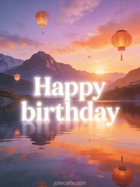 Share this photorealistic birthday card with mountains, a mirror lake, and floating lanterns in a glowing dawn sky. You can also browse free animated birthday cards adults, free animated birthday cards dromadaire, and dromadaire animated birthday cards.