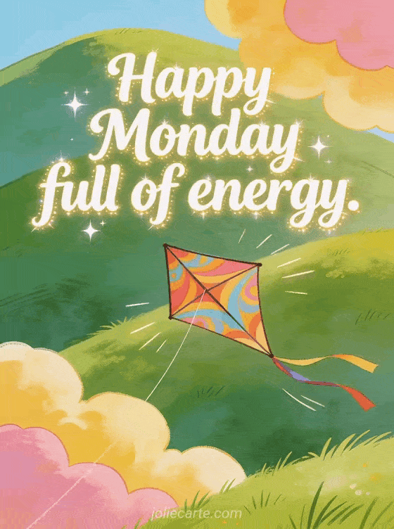Send an energetic happy Monday greeting with a kite flying above green hills and bright clouds in lively colors. Discover also good week and happy Monday gif, images to wish a happy monday or happy Monday and good week quote gif.