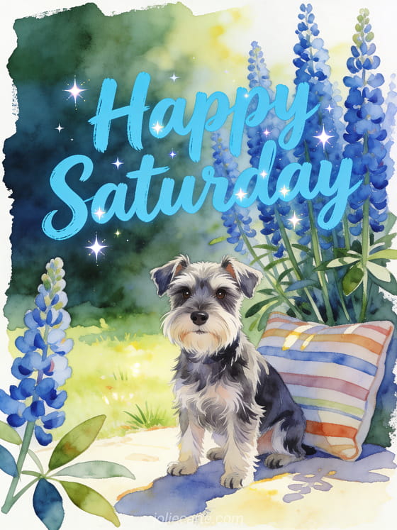 Wish happy Saturday with a lively miniature schnauzer, a striped cushion, tall blue lupines and a sunlit lawn. Discover also happy saturday and good weekend images, a happy saturday zen image or happy Saturday text.