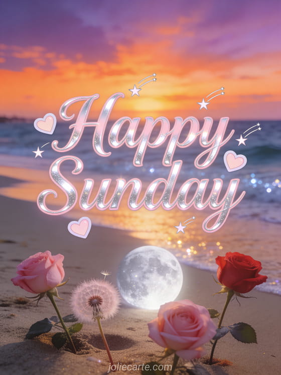Send an animated happy Sunday card with powder-pink script letters, silver highlights, pastel hearts and shooting stars above a glowing beach sunset. Share a romantic Sunday wish and discover also happy Sunday humor animated gif, good morning happy Sunday image or happy sunday and good day.