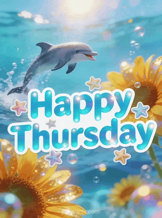 Send a joyful happy Thursday greeting with vivid turquoise lettering, starfish, iridescent bubbles, bright sunflowers in close-up and a dolphin leaping from the water in intense sunlight. You may also like this have a good thursday kisses, this good morning happy Thursday card or this free happy thursday card.