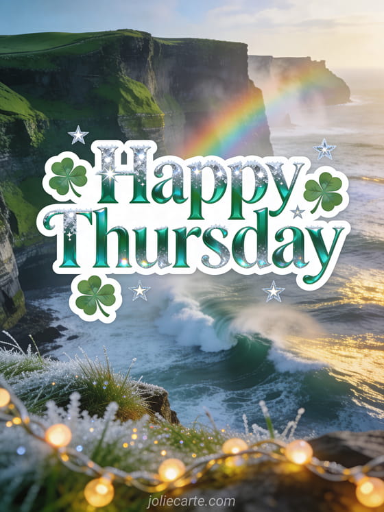 Share a bright happy thursday card with emerald green lettering, frosted silver reflections, four-leaf clovers, frosty stars, green Irish cliffs, powerful waves below, sparkling frosted grass, a rainbow in the sea spray and warm light garlands in the foreground. See also happy sunny thursday images, beautiful happy thursday kisses images or a happy thursday dog image.