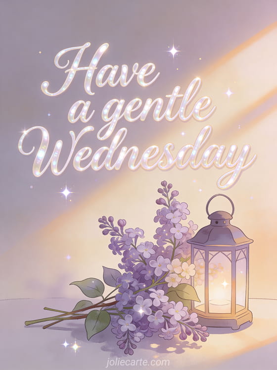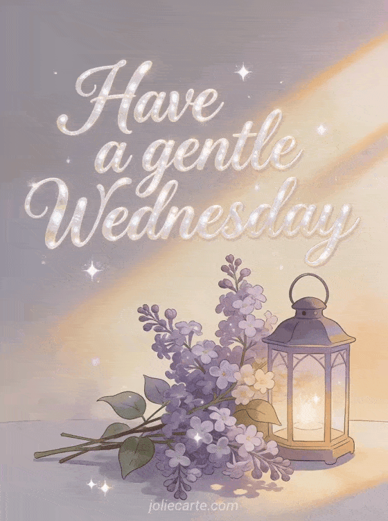 Share a gentle Wednesday greeting with smooth script calligraphy, pearly glow, lilac branches beside a tiny lantern, warm morning rays, and airy sparkle. Discover also good morning have a nice day have a nice Wednesday, hi happy Wednesday humor, or good morning it's Wednesday gif.