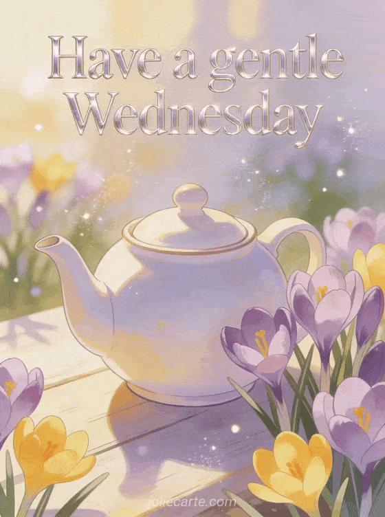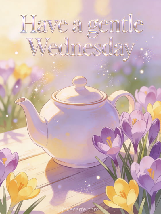 Share a gentle Wednesday greeting with airy lettering, subtle shine, crocus blooms around a porcelain teapot, sparkling dust, and calm spring light. Discover also good morning it's Wednesday, good morning my beautiful Wednesday, or good morning happy wednesday image.
