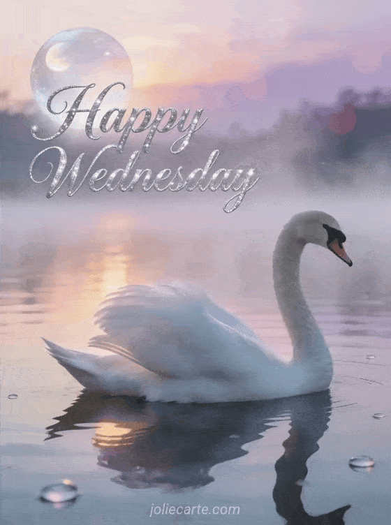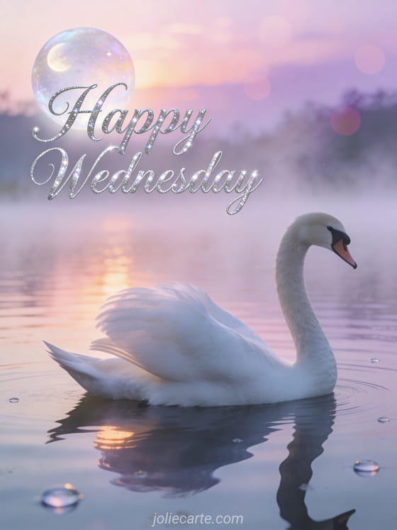 Send an elegant happy Wednesday greeting with a white swan gliding across a mirror-like lake at dawn, surrounded by soft mist and pastel reflections. Discover also happy Wednesday mountain, animated happy Wednesday images or good morning it's Wednesday.
