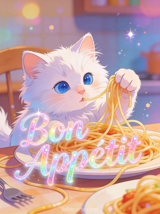 Share a colorful animated bon appétit greeting with this adorable kitten card. Discover also a pizza bon appétit card or a bon appétit card.