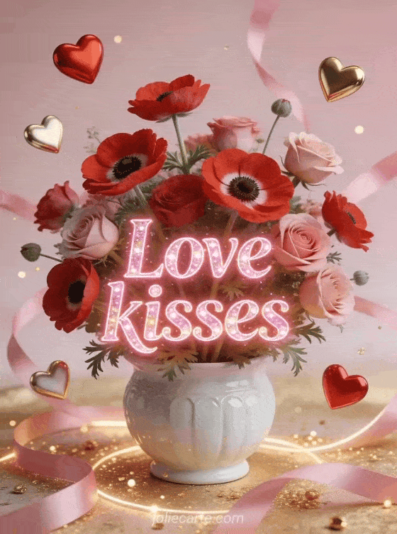 Send this romantic animated card with the words Love kisses written in glowing pink letters with sparkling effect, with a beautiful bouquet of red and pink anemones in a white ceramic pot, surrounded by red and golden 3D floating hearts. Discover also a love hugs kisses on the neck or a love kisses video.