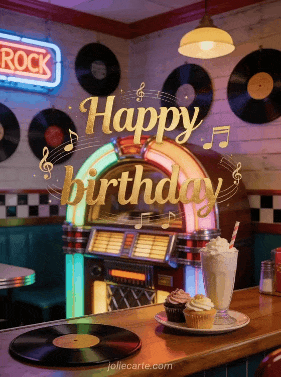 Send a rocking animated birthday card with a retro jukebox, vinyl records and cupcakes in a vintage American diner. Discover also an free animated birthday card with music or an animated happy birthday card.