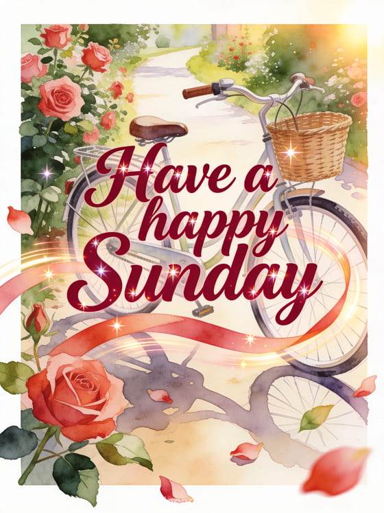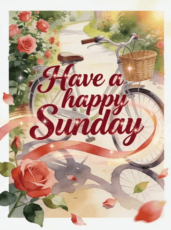 Send a joyful happy Sunday greeting with lively ruby red script, sparkling highlights, a vintage bicycle with a woven basket, rose blossoms, a bright garden lane and warm light. You can also share a Sunday kisses gif, a religious happy sunday gif or cards to wish happy Sunday.