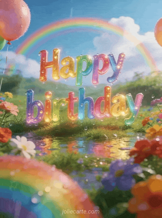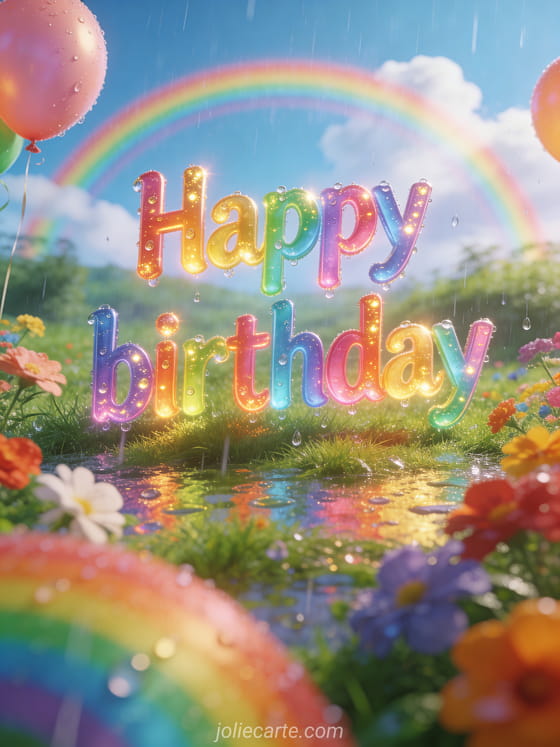 Share a bright happy birthday wish with multicolored rainbow lettering, a full rainbow over a green landscape after the rain, flowers, rainbow balloons, golden light, and sparkling water drops. You can also send happy birthday wishes, a flower happy birthday card, or a happy birthday and cat card.