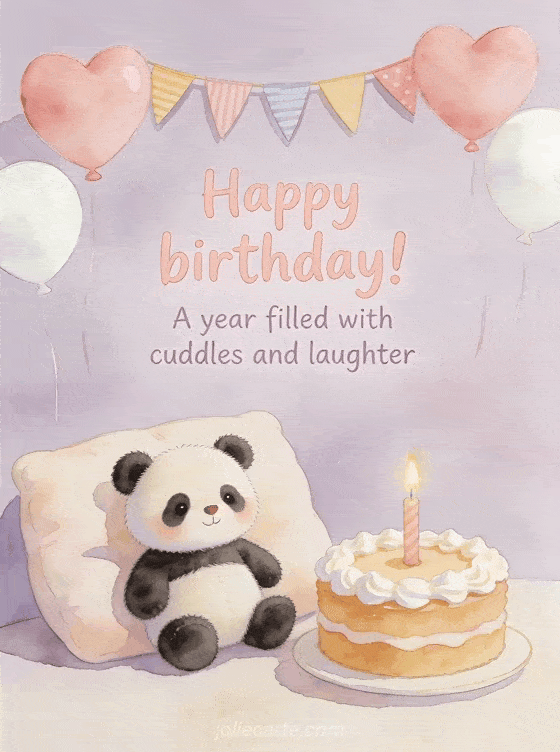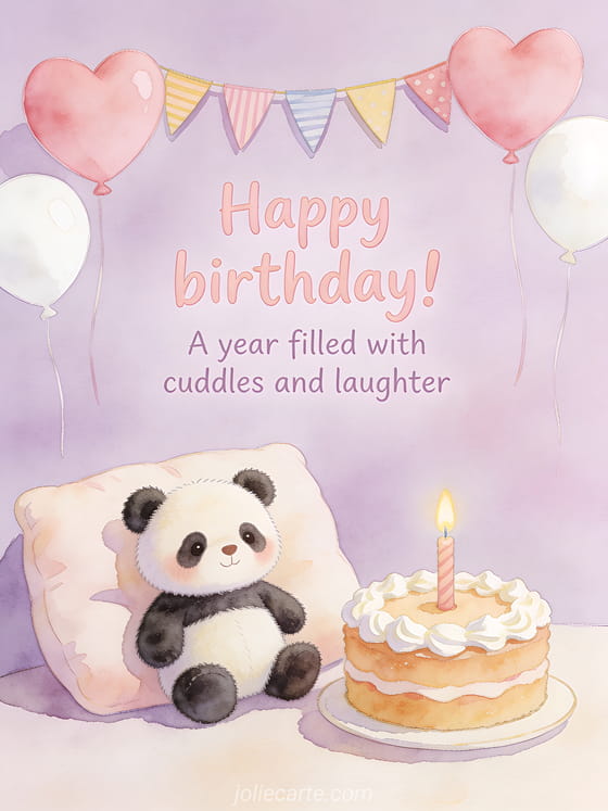 Celebrate a baby's first year with a soft illustration of a plush panda on a fluffy cushion beside a birthday cake and candle, colorful bunting, pink and white heart balloons, and a warm lavender background. Discover also baby first birthday text, happy birthday my baby, or happy birthday my 1 year old baby.