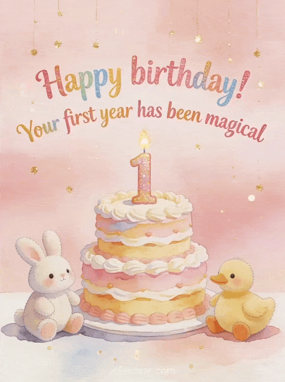 Celebrate a magical first year with a soft watercolor birthday card showing a beautiful tiered cake topped with a number 1 candle, pastel cream, a plush rabbit and duck, and gentle golden glitter on a powder pink background. Discover also happy birthday my baby, happy birthday my 1 year old baby, or baby first birthday text.