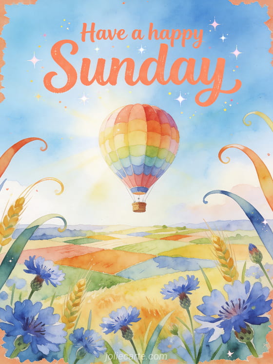 Share a radiant happy Sunday greeting with a colorful hot air balloon over patchwork fields, cornflowers and a soft blue sky. Discover also happy Sunday wish image, sparkling happy Sunday gifs or happy sunday animated cards.