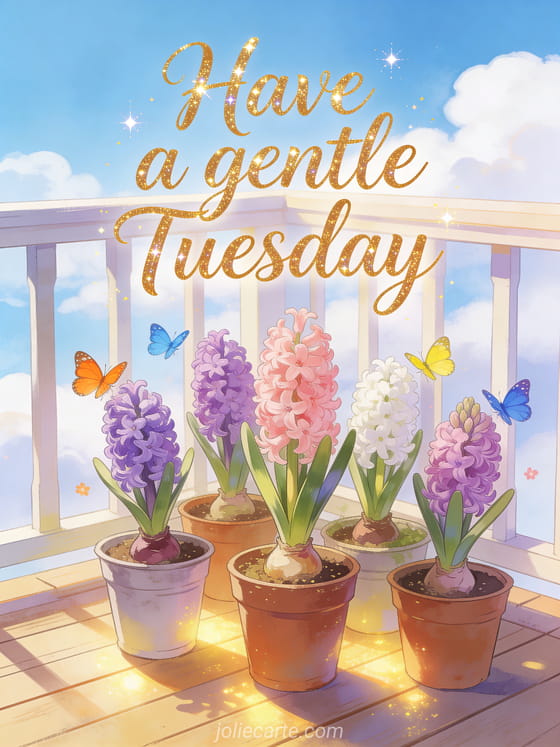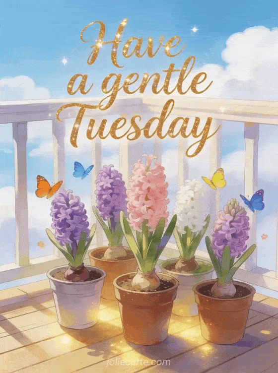 Share beautiful animated happy Tuesday images with flowing brush lettering, hyacinth pots on a sunny terrace and colorful butterflies glowing in the light. You can also send a happy Tuesday rain image, happy Tuesday Facebook images or a happy Tuesday in the rain image.
