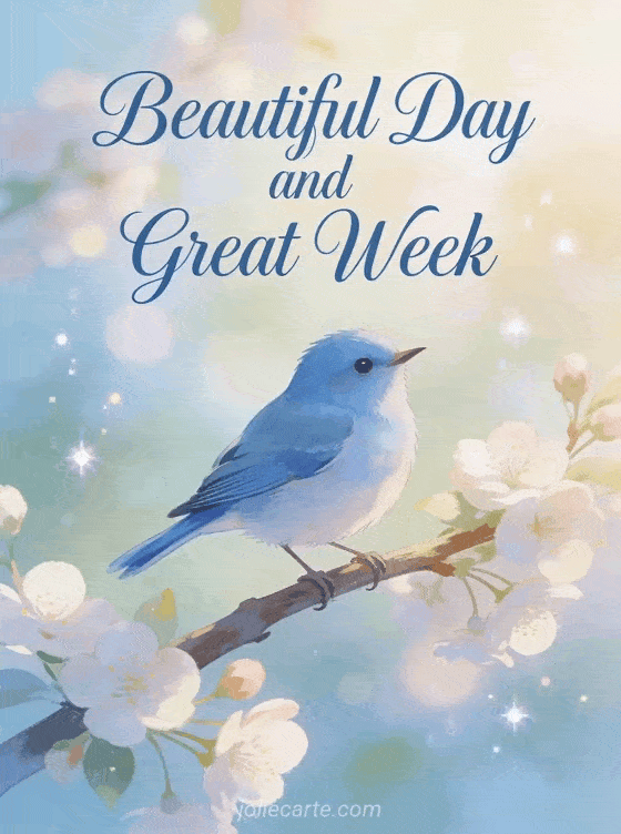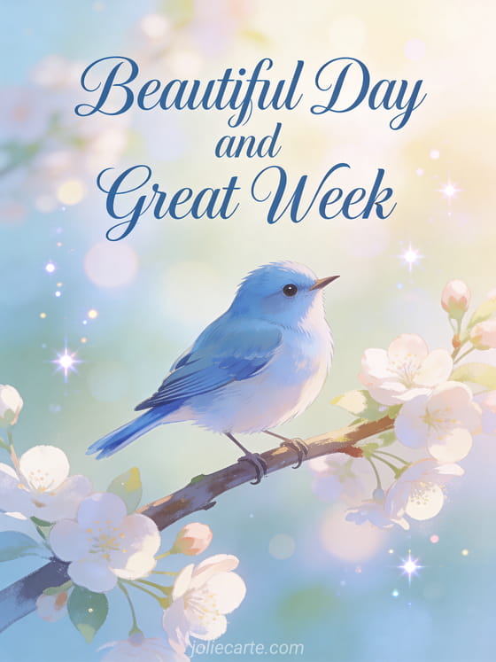 Send a beautiful day and good week wish to brighten someone's morning. A delicate bluebird singing on a branch with spring blossoms creates a fresh and joyful atmosphere. Discover also a good week flowers card or a have a great week motivation card.