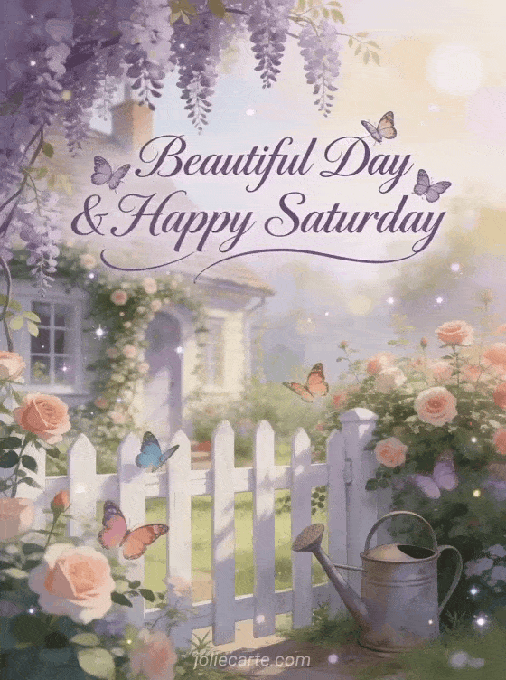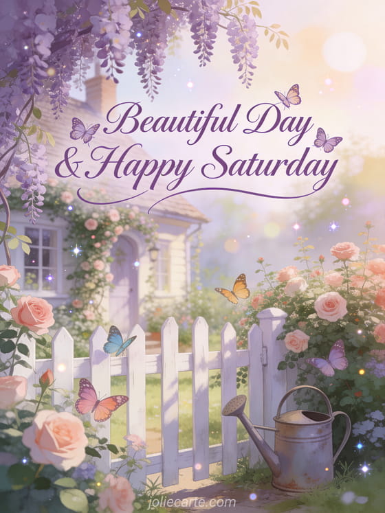 Share a charming Saturday greeting with a cottage garden, climbing roses, wisteria, a white fence, and colorful butterflies in the morning light. Discover also a good morning saturday card or Saturday kisses gifs.