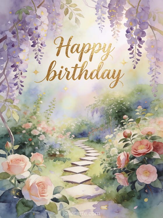 Send a delicate watercolor birthday card with a lush flowering garden featuring wisteria, roses and camellias along a stone path. Discover also birthday flowers for women or a funny birthday woman.