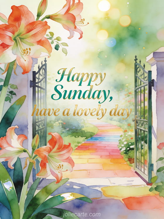 Wish a lovely sunday with an open garden gate leading to a colorful path, amaryllis blooms and polished leaves glowing in fresh light. Discover also a beautiful happy Sunday text, a happy Sunday heart gif or good morning sunday images.