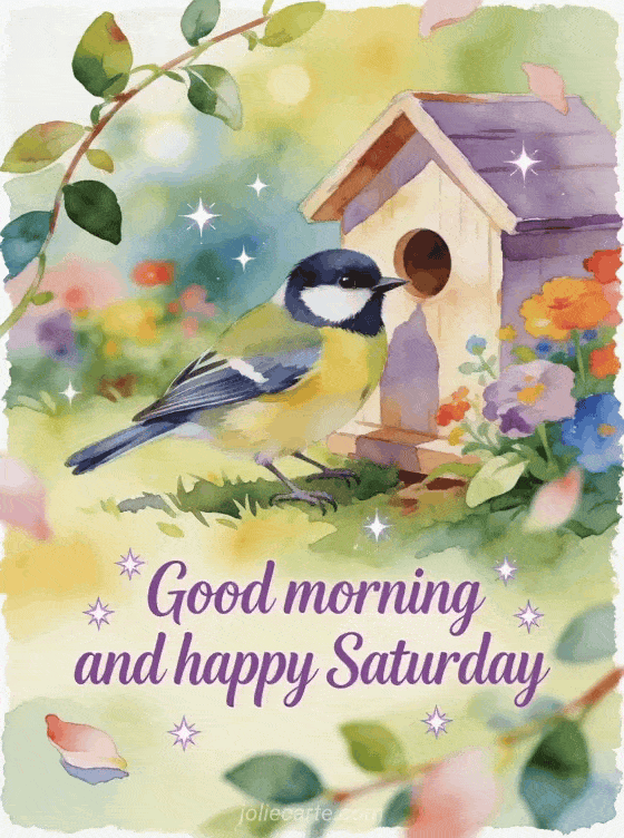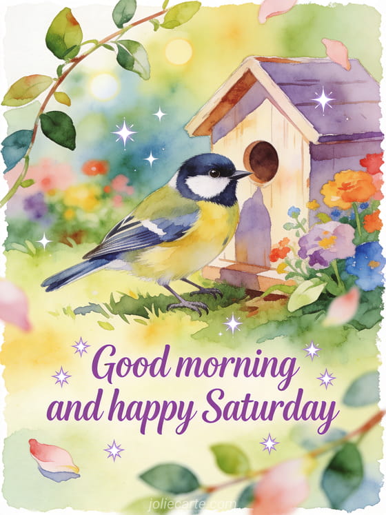 Share a bright Saturday morning message with a great tit bird near a little birdhouse in a colorful garden corner. Discover also a happy saturday woman image, a happy Saturday coffee gif or a happy saturday everyone image.