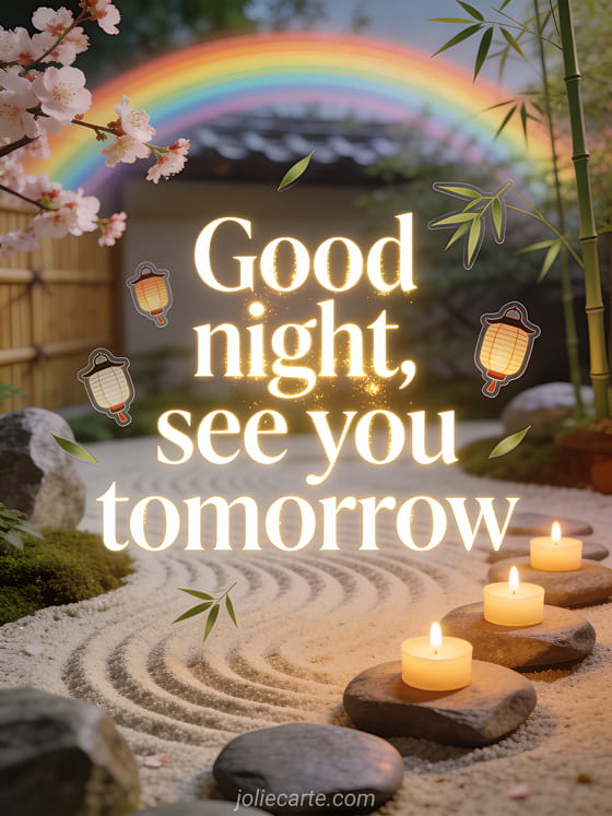 Share a peaceful good night with this beautiful card featuring a zen garden with raked sand and stones, Japanese lanterns, lit candles, cherry blossoms and a rainbow in warm soothing light. Discover also a funny good night message, good night photos or a good night thought.