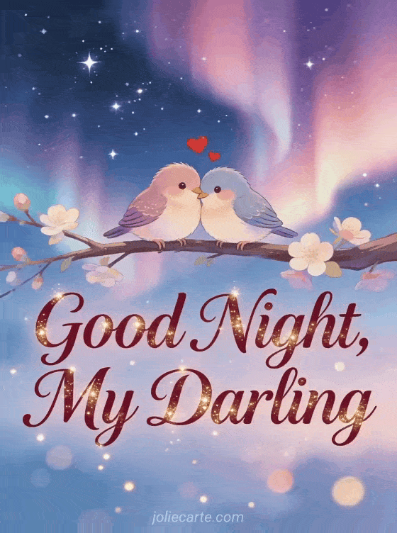 Send this beautiful romantic good night message for him with two adorable lovebirds cuddling under a starry sky with a soft pink and purple aurora borealis. Discover also a beautiful good night messages card or a good night card.