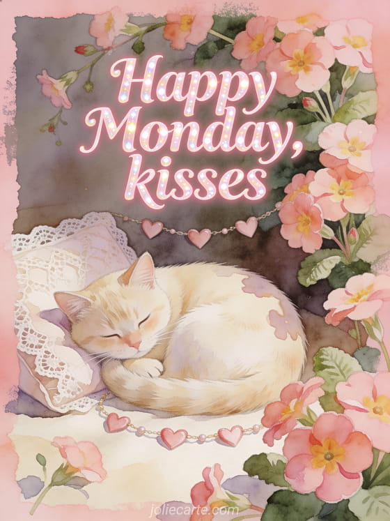 Send beautiful happy monday kisses images with pink watercolor lettering, a cream cat curled near a lace cushion, a tiny heart garland and primrose blossoms crossing the border. Discover also this happy Monday quote image card, this happy monday in the rain image card or this happy Monday and good week animated gif card.