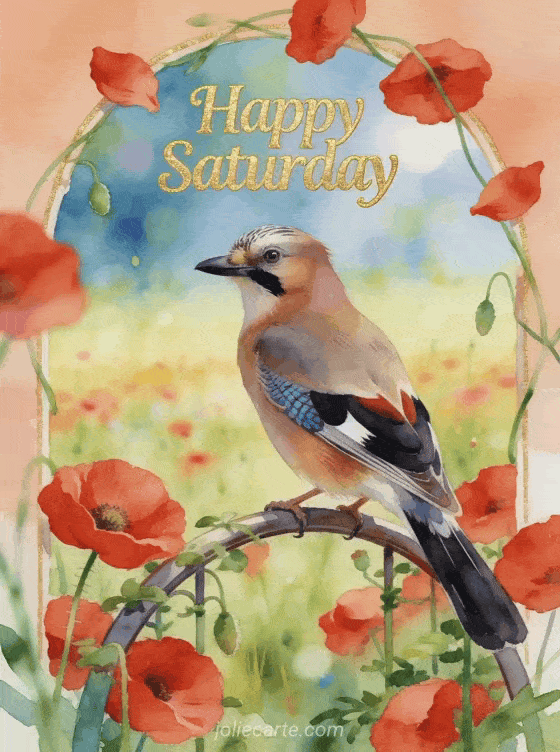 Share a colorful happy Saturday message with a delicate watercolor scene full of poppies and warm meadow light. You can also send a Saturday good day image, a happy saturday gif images or a happy saturday coffee kisses.