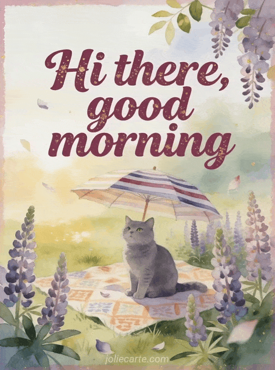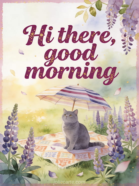 Send a friendly good morning greeting with a Russian blue cat under a striped parasol, surrounded by lupins, a picnic cloth and sunlit grass. Discover also a hi good day gifs, a beautiful hi lots of kisses card or a hi good morning card.