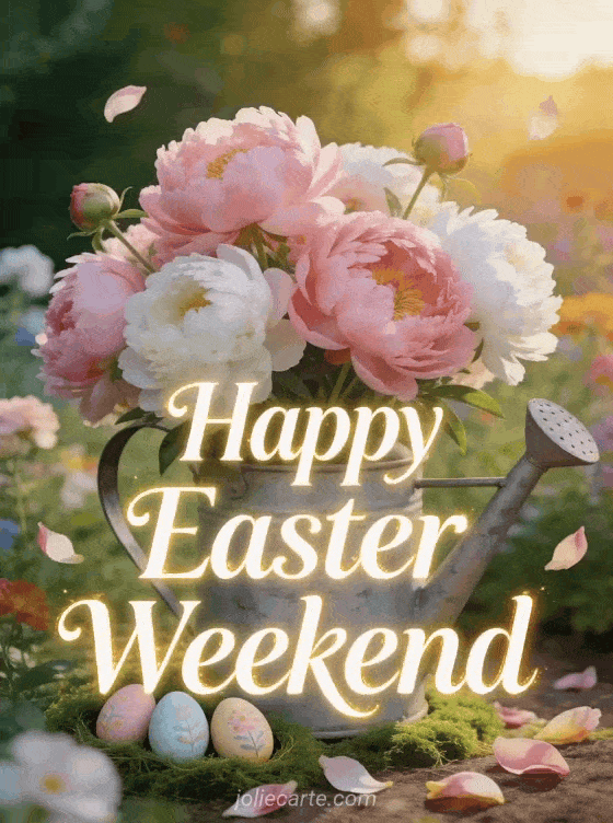 Wish a happy Easter weekend with this romantic card featuring pink peonies in a vintage zinc watering can, hand-painted Easter eggs on green moss, and golden sunset light. Discover also a happy Easter weekend card, Easter weekend greeting, or happy Easter weekend to all.