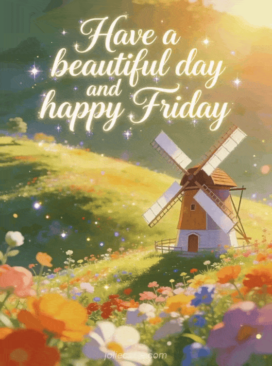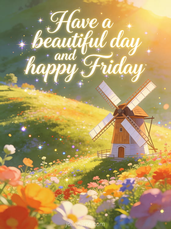Share a beautiful happy Friday image with flowing ivory lettering, a sunny hillside, a classic windmill and bright flowers glowing with gentle glitter light. Discover also happy Friday sun gif, a happy Friday image with flowers or wintry happy Friday gif.
