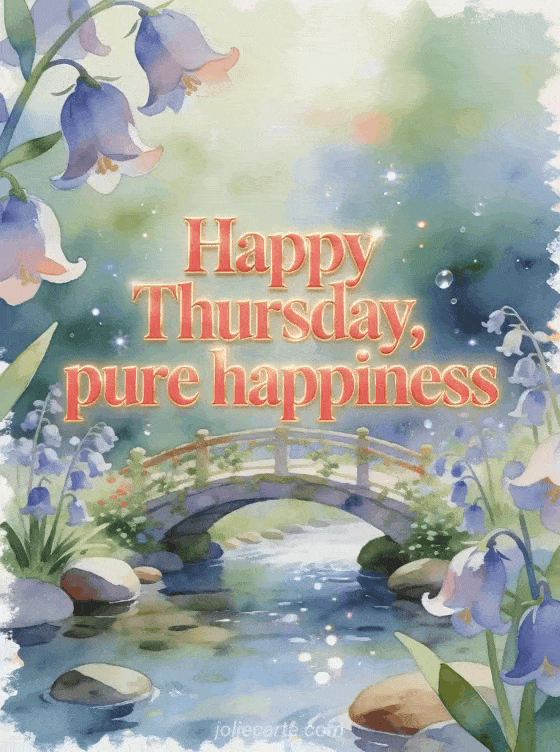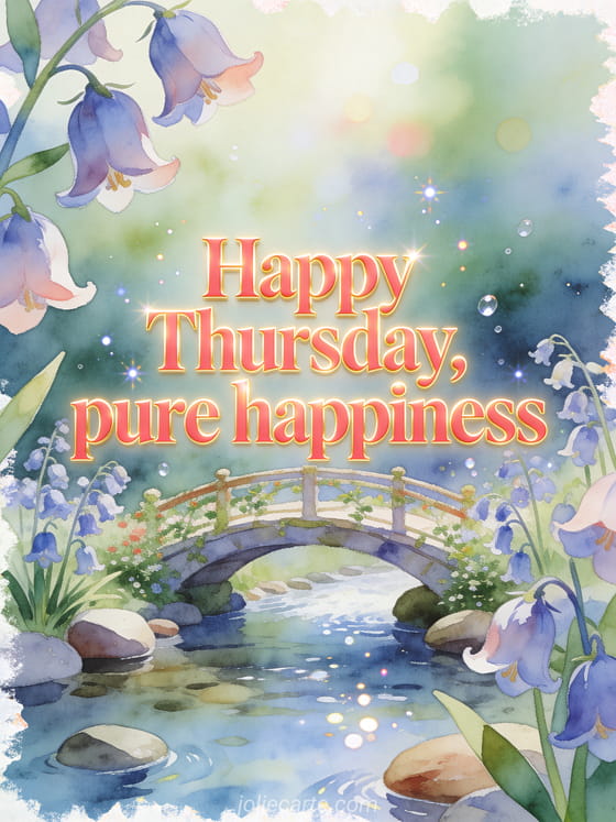 Wish a happy Thursday full of happiness with a small arched garden bridge over a clear stream, bellflowers and smooth river stones in luminous watercolor colors. Discover also a sunny happy thursday image, images for happy Thursday or a happy thursday poem.