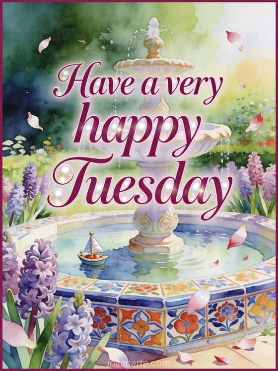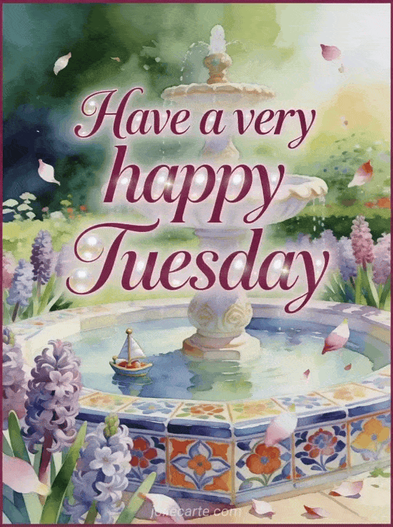 Share a beautiful Tuesday message with an ornate garden fountain, hyacinth flowers, bright ceramic tiles and a little sailboat ornament. Discover also a good morning Tuesday animated gif, a happy Tuesday coffee image or a happy tuesday coffee gif.