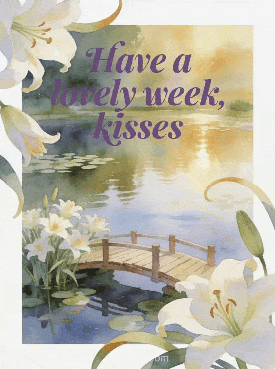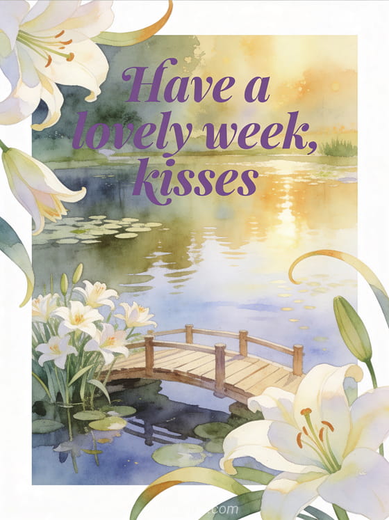 Send a gentle card with a calm lily pond, a small wooden bridge and fresh lily blooms in soft luminous light. Discover also a free good week kisses image, a good week gif kisses or a good week to you too kisses.