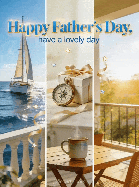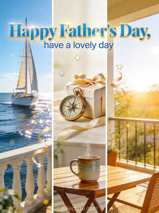 Wish Dad a lovely day with a realistic Father's Day collage featuring a sailboat on sparkling water, a compass beside a ribboned gift and a sunny terrace with a mug. This airy, joyful design feels bright and festive. Discover also a personalized Father's Day card, easy Father's Day card or a father's day card design.