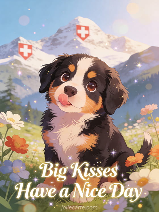 Share warmth with this big kisses have a nice day card featuring an adorable Bernese Mountain Dog puppy surrounded by alpine flowers in Swiss mountains. Discover also a good morning my love have a good day or a have a nice day proverb card.