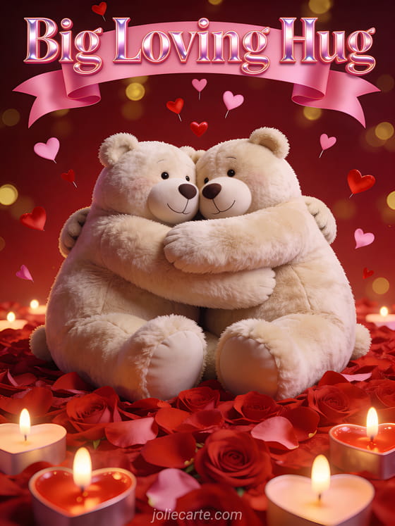 Send this passionate hug card featuring two giant teddy bears embracing on a bed of red rose petals surrounded by heart-shaped candles with little red and pink hearts falling like a rain of love. A romantic way to send a warm hug. Discover also a love hug card with swans or a comforting hug card.