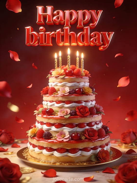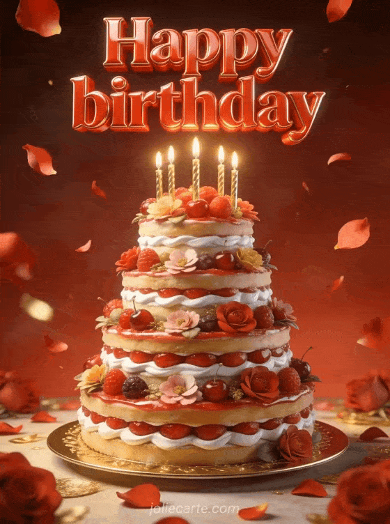 Celebrate with an animated birthday card featuring a spectacular five-tier cake, red fruits, and golden candles. Discover also birthday animated images, free animated birthday card boy, and free animated virtual birthday card.