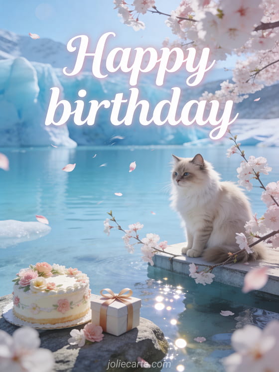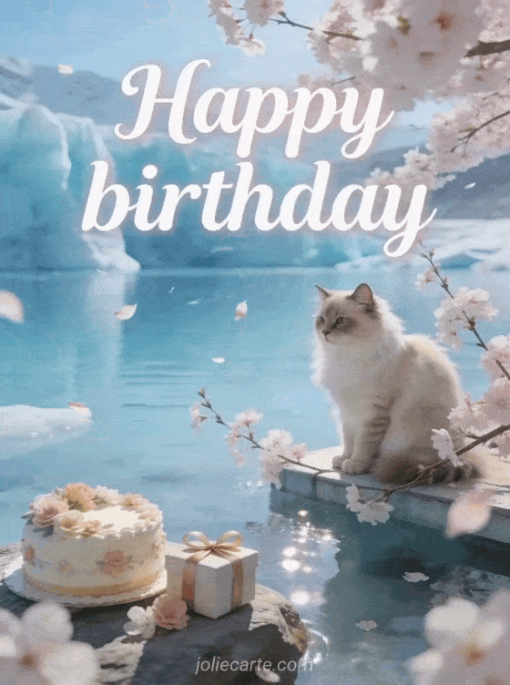 Send a tender birthday card with a Turkish angora cat beside a milky blue glacial lake, cherry blossoms, a flower-decorated cake and a wrapped gift. You can also share a bro happy birthday my brother gif, a happy birthday little brother gif or a happy birthday little bro card.