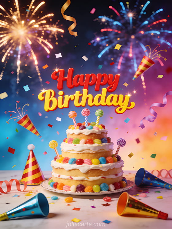 Celebrate a child's birthday with this vibrant party card featuring a towering cake covered in colorful candies and lollipops, party hats, trumpets and flying streamers against a multicolored burst with fireworks. A joyful card that will delight kids of all ages. Discover also a virtual birthday card for a princess child or a happy birthday little unicorn card.