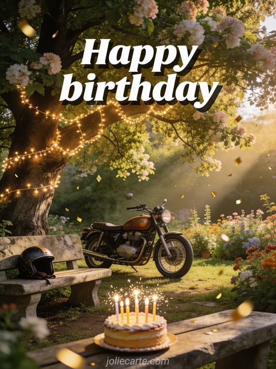 Share this charming birthday card for the motorcycle lover in your life, with a vintage bike in a blooming garden. Discover also a free birthday card for men by text or a birthday message for men card.