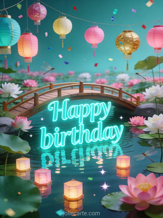 Send this festive and zen birthday card for teens with a wooden bridge over a lotus pond, colorful lanterns and reflections on calm water. Discover also a happy birthday teenage girl card or a birthday message for teens.