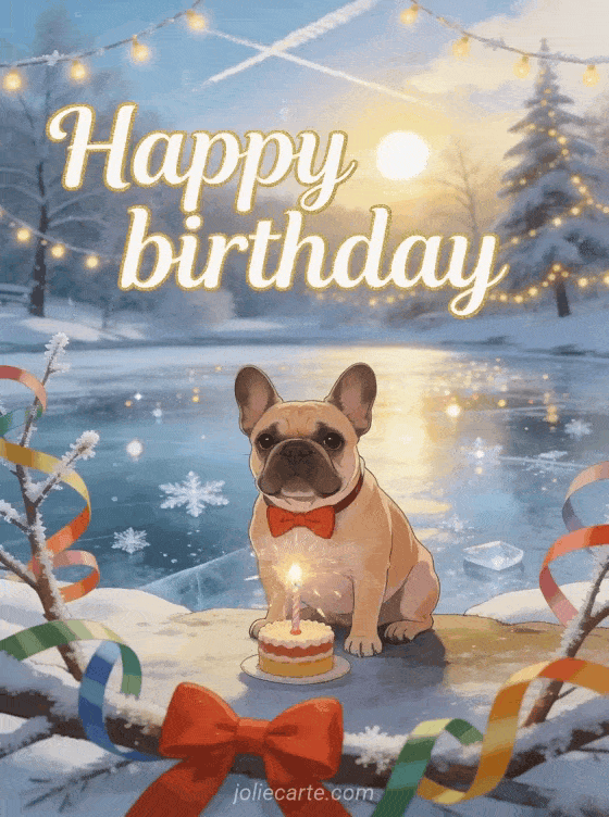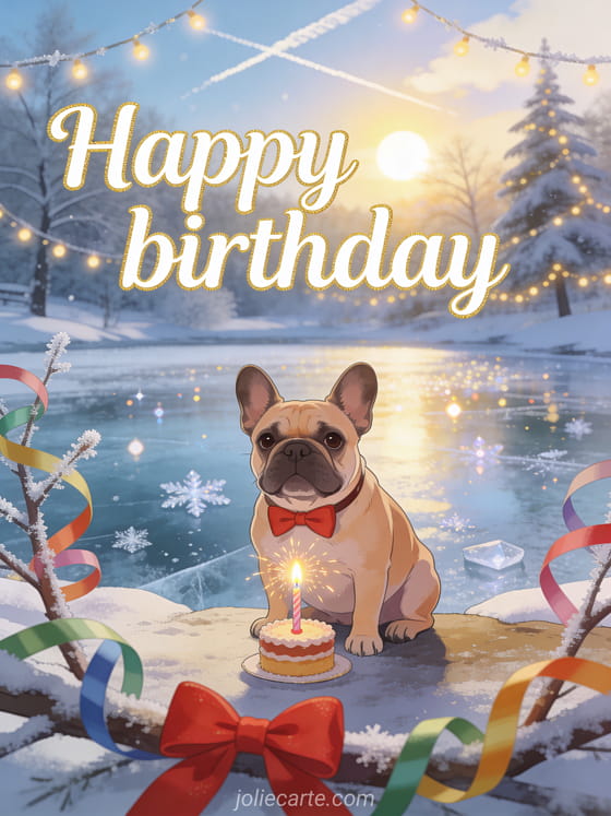 Send this birthday card for woman with dog — an adorable French bulldog with a red bow tie sitting by a sparkling frozen pond, with colorful streamers and sparklers. Discover also a happy birthday beautiful lady or a funny birthday images for women.
