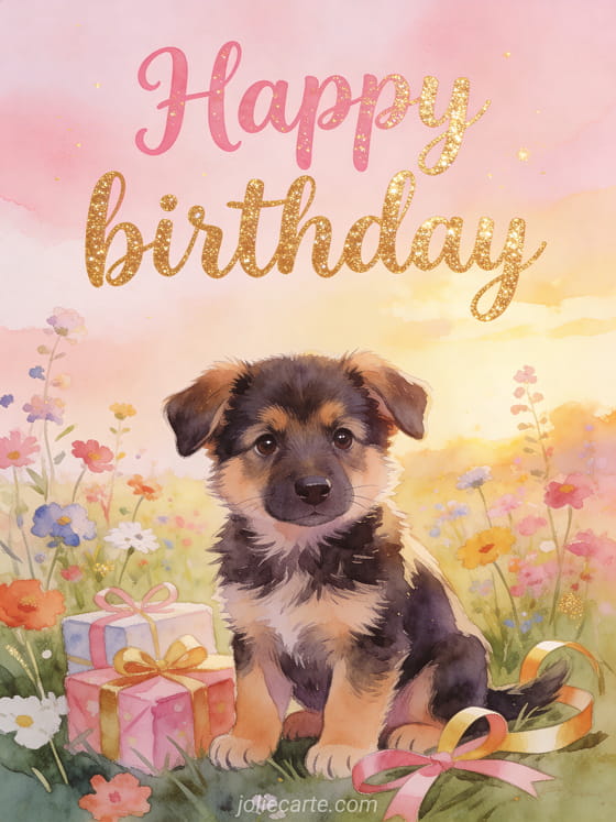 Share this charming birthday card for a child with a sweet German shepherd puppy surrounded by wildflowers and gifts. Discover also a birthday card for child party card or a virtual birthday card child princess card.