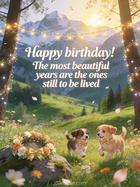 Happy birthday! The most beautiful years are the ones still to be lived A warm and hopeful birthday message in a bright alpine spring scene.