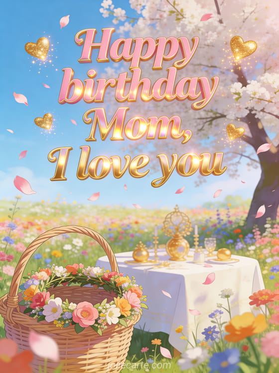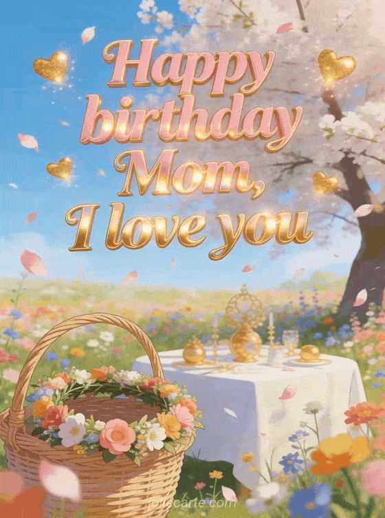Tell mom you love her with pink and gold letters, a bright spring field of wildflowers, a festive flower crown on a wicker basket, a table under a blooming tree, flying petals, and sparkling golden hearts. You can also send happy birthday mom images, a happy birthday mom animated card, or a happy birthday mom gif.